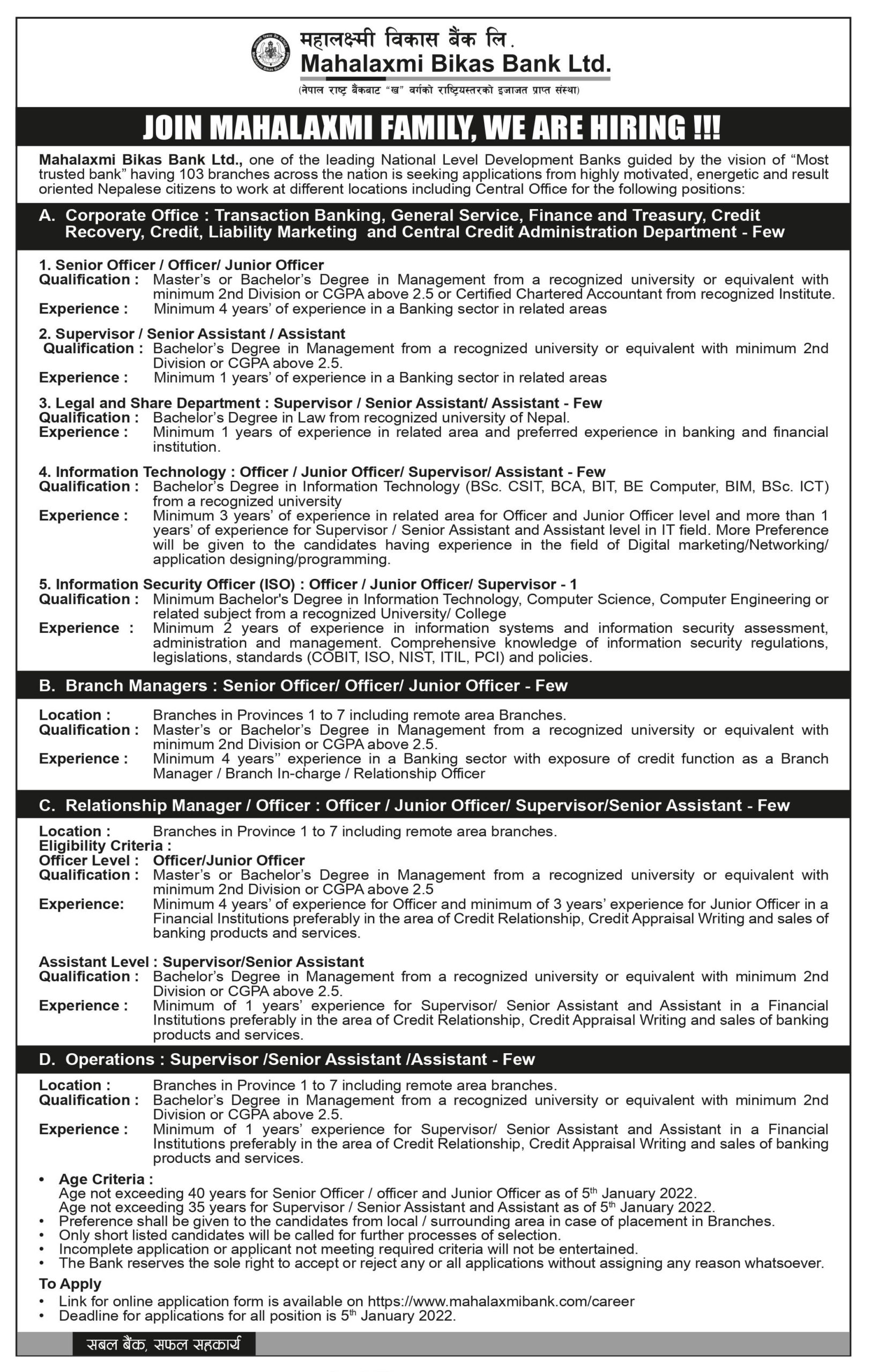 इच्छुक योग्यता पुगेका ब्यक्तिले पुष १९ गतेसम्म बैंकको वेबसाइट https://www.mahalaxmibank.com/career/ मार्फत आवेदन दिन सक्नेछन् ।