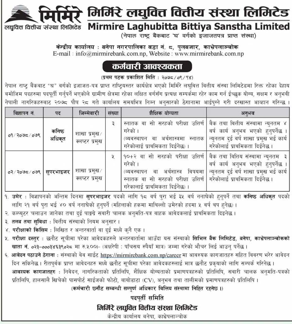 योग्यता पुगेका इच्छुक ब्यक्तिले पुष २८ गतेसम्म ५०० रुपैयाँ भौचर तिरेर कम्पनीको वेबसाइट https://www.mirmirebank.com.np/career मार्फत आवेदन दिन सक्नेछन् ।