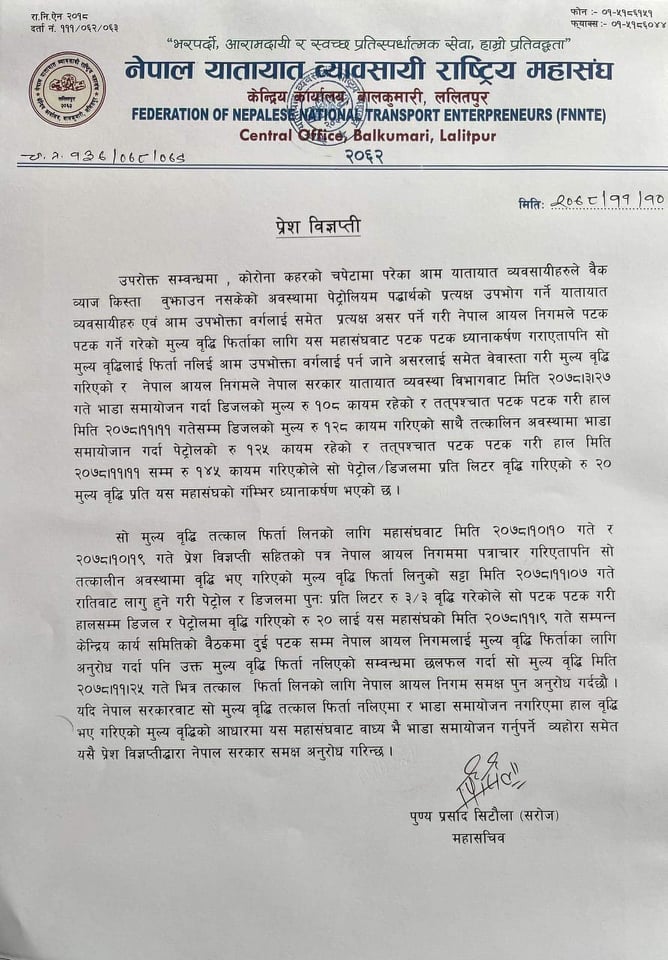 नेपाल यातायात राष्ट्रिय व्यवसायी महासंघले एक विज्ञप्ती जारी गर्दै कोरोना कहरको चपेटामा परेका आम यातायात व्यवसायीहरुले बैंक व्याज किस्ता बुझाउन नसकेको अवस्थामा पेट्रोलियम पद्धार्थको प्रत्यक्ष उपभोग गर्ने यातायात व्यवसायीहरु र उपभोक्तालाई समेत प्रत्यक्ष असर गरेको जनाएको हो ।