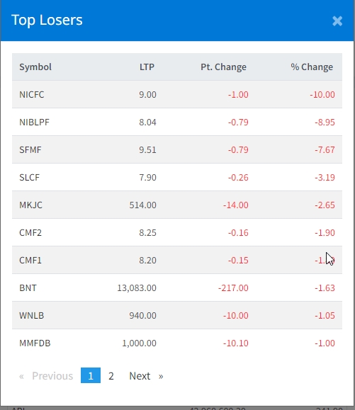 त्यस्तै, एनआइबिएल प्रगति फण्डको ८.९५, सनराइज फस्ट म्युचल फण्डको ७.६७, सानिमा लार्ज क्याप फण्डको ३.१९ र मैलुङ खोला जलबिद्युतको २.६५ प्रतिशतले शेयर मूल्य घटेको छ ।
