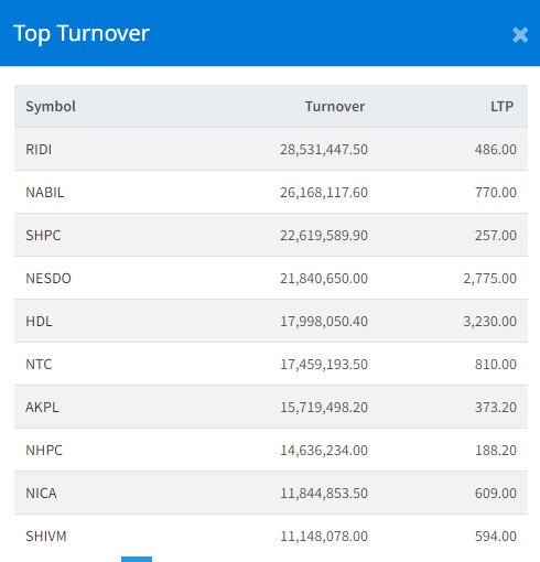 त्यस्तै, नबिल बैंकको २ करोड ६१ लाख, सामलिङ पावरको २ करोड २६ लाख, नेष्डो समृद्ध लघुवित्तको २ करोड १८ लाख र हिमालयन डिस्टिलरीको १ करोड ७९ लाख रुपैयाँमाथिको कारोबार भएको छ ।