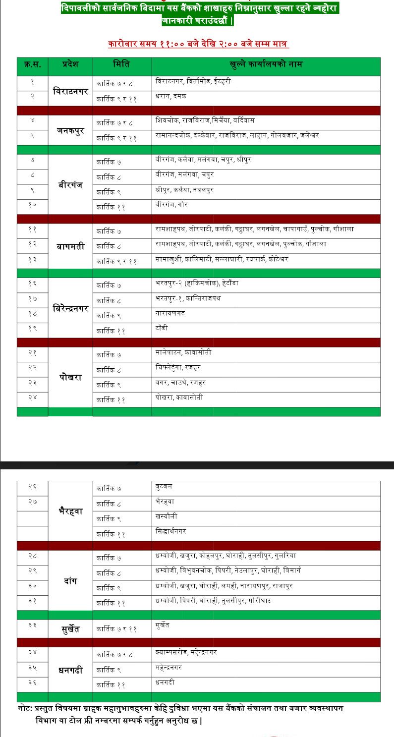 तिहारमा यस बैंकका यी शाखाहरू यी समयमा खुल्नेछ :