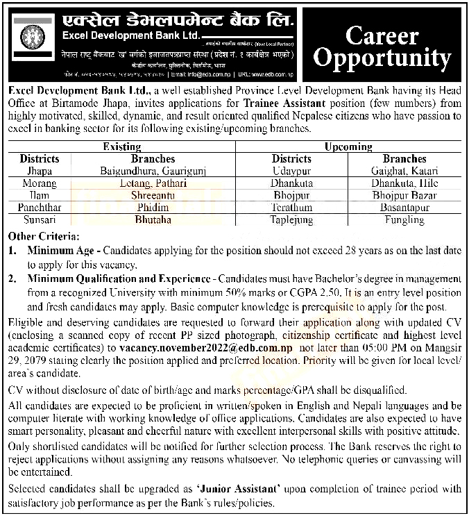 संस्थाले १० वटा शाखाको लागि ट्रेनि एसिस्टेन्ट पदमा केहि संख्यामा कर्मचारी माग गरेको छ । सो पदहरुमा आवेदन दिनको लागि व्यवस्थापन संकाय तर्फमा स्नातक तह उत्तिर्ण गरेको हुनुपर्ने जनाएको हो ।